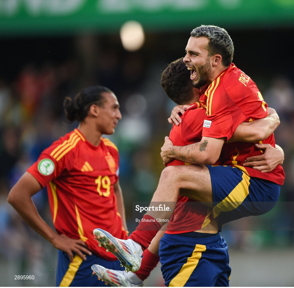 28 July 2024; David Mella of Spain celebrates after his side's victory in the UEFA European U19 Championship finals match between Spain and France at the National Football Stadium at Windsor Park, Belfast. Photo by Shauna Clinton/Sportsfile