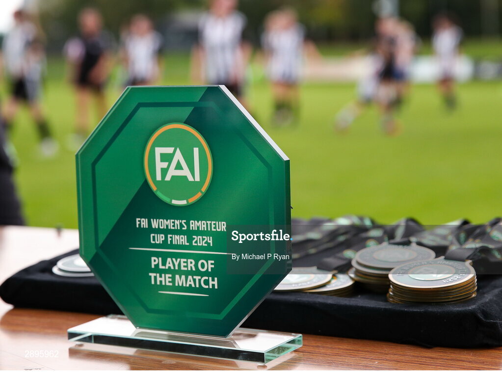 28 July 2024; A general view of the eplayer of the match award after the FAI Women's Amateur Cup Final 2024 match between Whitehall Rangers and Terenure Rangers at UCD Bowl in Dublin. Photo by Michael P Ryan/Sportsfile