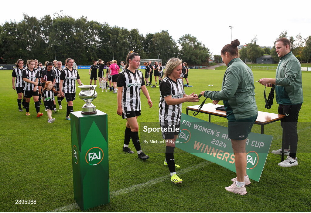 28 July 2024; Whitehall Rangers players including captain Charlie Graham recieve their runners up medals from FAI head of women's football Hannah Dingley after the FAI Women's Amateur Cup Final 2024 match between Whitehall Rangers and Terenure Rangers at UCD Bowl in Dublin. Photo by Michael P Ryan/Sportsfile