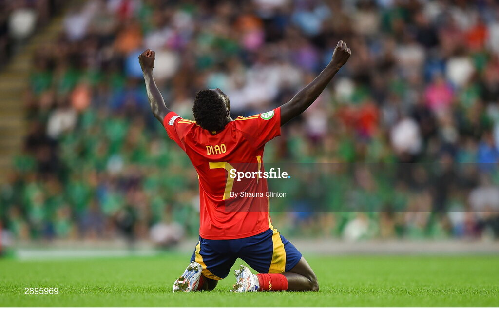 28 July 2024; Assane Diao of Spain celebrates at the final whistle of the UEFA European U19 Championship finals match between Spain and France at the National Football Stadium at Windsor Park, Belfast. Photo by Shauna Clinton/Sportsfile