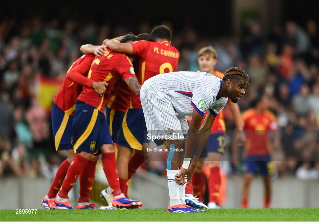 28 July 2024; Steve Ngoura of France reacts at the final whistle of the UEFA European U19 Championship finals match between Spain and France at the National Football Stadium at Windsor Park, Belfast. Photo by Shauna Clinton/Sportsfile