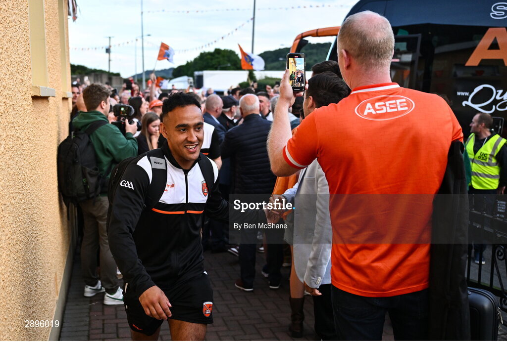 28 July 2024; Jamar Hall of Armagh at the Armagh team homecoming to their team hotel at the Carrickdale Hotel in Dundalk, Louth, after their victory over Galway in the GAA Football All-Ireland Senior Championship Final match at Croke Park in Dublin earlier. Photo by Ben McShane/Sportsfile