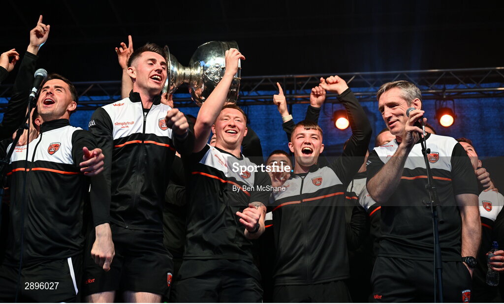 28 July 2024; Armagh manager Kieran McGeeney looks on as his players celebrate with the Sam Maguire cup at the Armagh team homecoming to their team hotel at the Carrickdale Hotel in Dundalk, Louth, after their victory over Galway in the GAA Football All-Ireland Senior Championship Final match at Croke Park in Dublin earlier. Photo by Ben McShane/Sportsfile