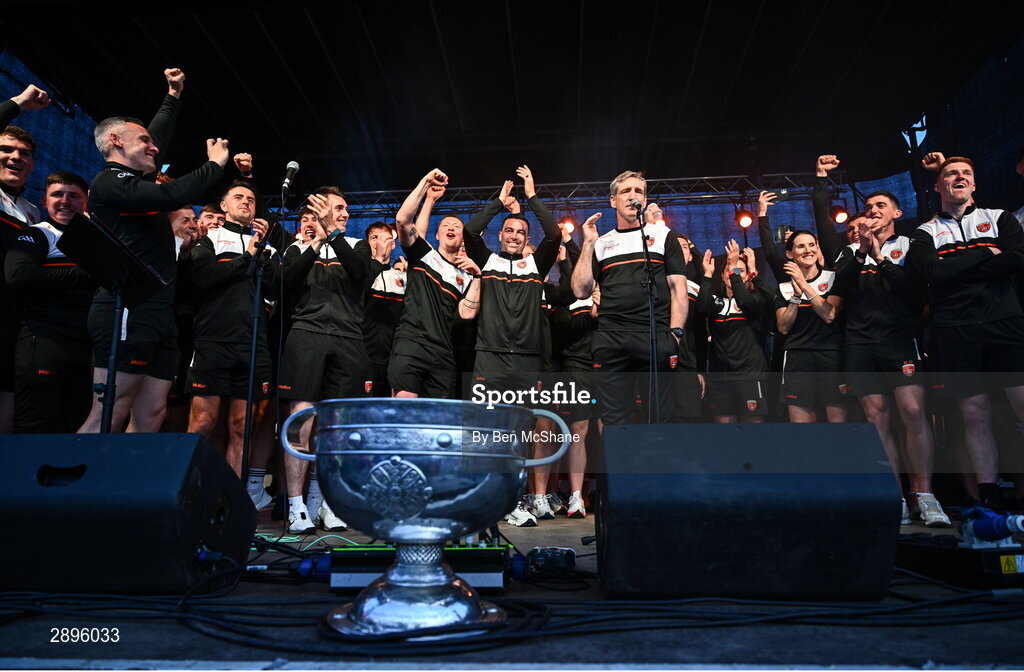 28 July 2024; Armagh manager Kieran McGeeney makes a speech at the Armagh team homecoming to their team hotel at the Carrickdale Hotel in Dundalk, Louth, after their victory over Galway in the GAA Football All-Ireland Senior Championship Final match at Croke Park in Dublin earlier. Photo by Ben McShane/Sportsfile