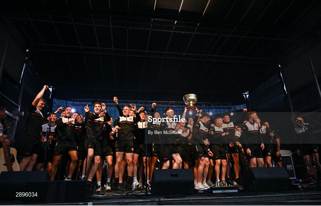 28 July 2024; Armagh players celebrate with the Sam Maguire cup at the Armagh team homecoming to their team hotel at the Carrickdale Hotel in Dundalk, Louth, after their victory over Galway in the GAA Football All-Ireland Senior Championship Final match at Croke Park in Dublin earlier. Photo by Ben McShane/Sportsfile