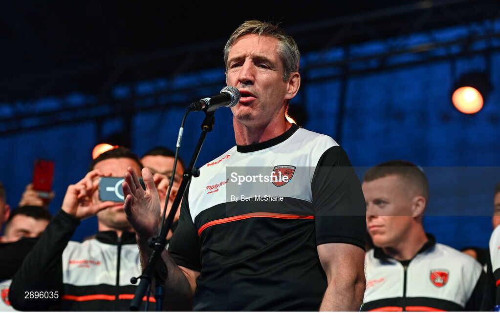 28 July 2024; Armagh manager Kieran McGeeney makes a speech at the Armagh team homecoming to their team hotel at the Carrickdale Hotel in Dundalk, Louth, after their victory over Galway in the GAA Football All-Ireland Senior Championship Final match at Croke Park in Dublin earlier. Photo by Ben McShane/Sportsfile