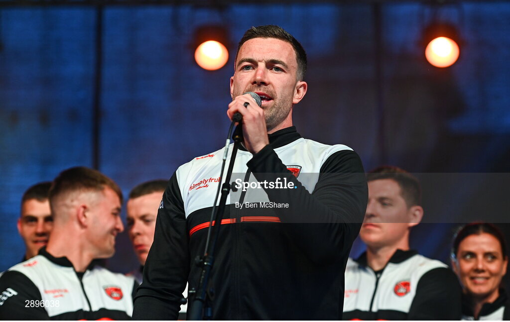 28 July 2024; Armagh captain Aidan Forker makes a speech at the Armagh team homecoming to their team hotel at the Carrickdale Hotel in Dundalk, Louth, after their victory over Galway in the GAA Football All-Ireland Senior Championship Final match at Croke Park in Dublin earlier. Photo by Ben McShane/Sportsfile