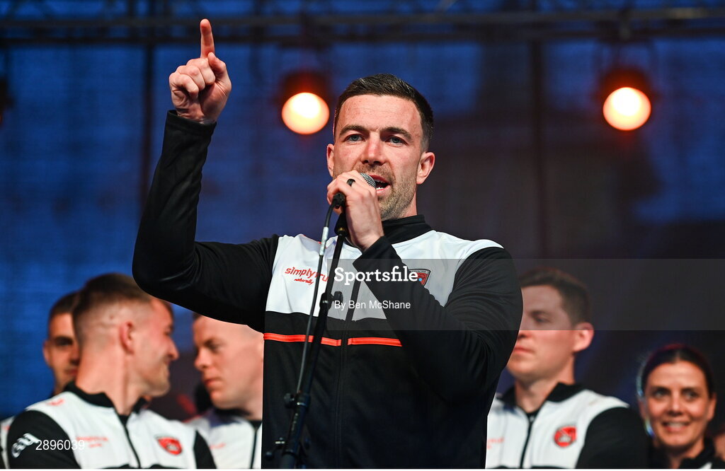 28 July 2024; Armagh captain Aidan Forker makes a speech at the Armagh team homecoming to their team hotel at the Carrickdale Hotel in Dundalk, Louth, after their victory over Galway in the GAA Football All-Ireland Senior Championship Final match at Croke Park in Dublin earlier. Photo by Ben McShane/Sportsfile