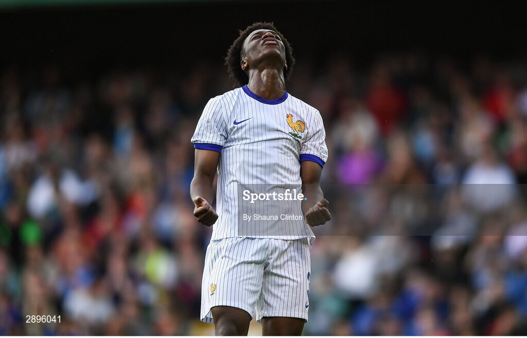 28 July 2024; Aboubaka Soumahoro of France reacts to a missed shot on goal during the UEFA European U19 Championship finals match between Spain and France at the National Football Stadium at Windsor Park, Belfast. Photo by Shauna Clinton/Sportsfile