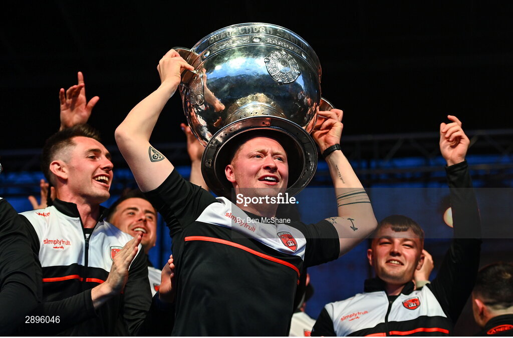28 July 2024; Armagh goalkeeper Blaine Hughes celebrates alongside his teammates with the Sam Maguire cup at the Armagh team homecoming to their team hotel at the Carrickdale Hotel in Dundalk, Louth, after their victory over Galway in the GAA Football All-Ireland Senior Championship Final match at Croke Park in Dublin earlier. Photo by Ben McShane/Sportsfile