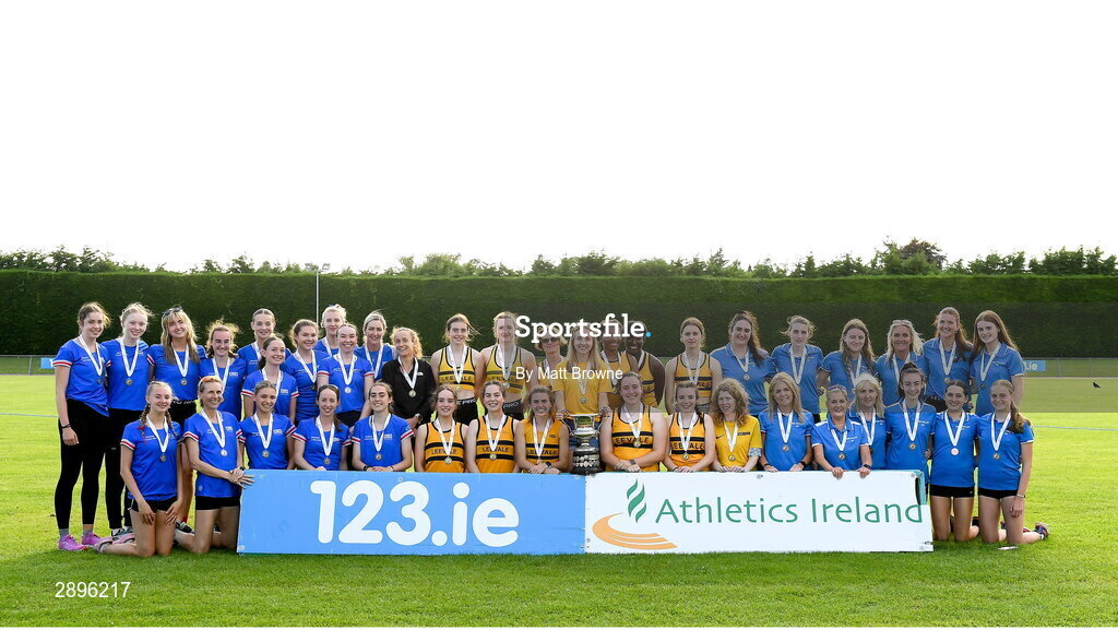 28 July 2024; The Dundrum South Dublin AC team who came second in the Women's Premier Event, left, with the Leevale AC team who won the Premier event, centre, and the Finn Valley AC team who came third in the Premier Women's event at the 123.ie National Track and Field League Final at Tullamore Harriers Athletics Club in Offaly. Photo by Matt Browne/Sportsfile