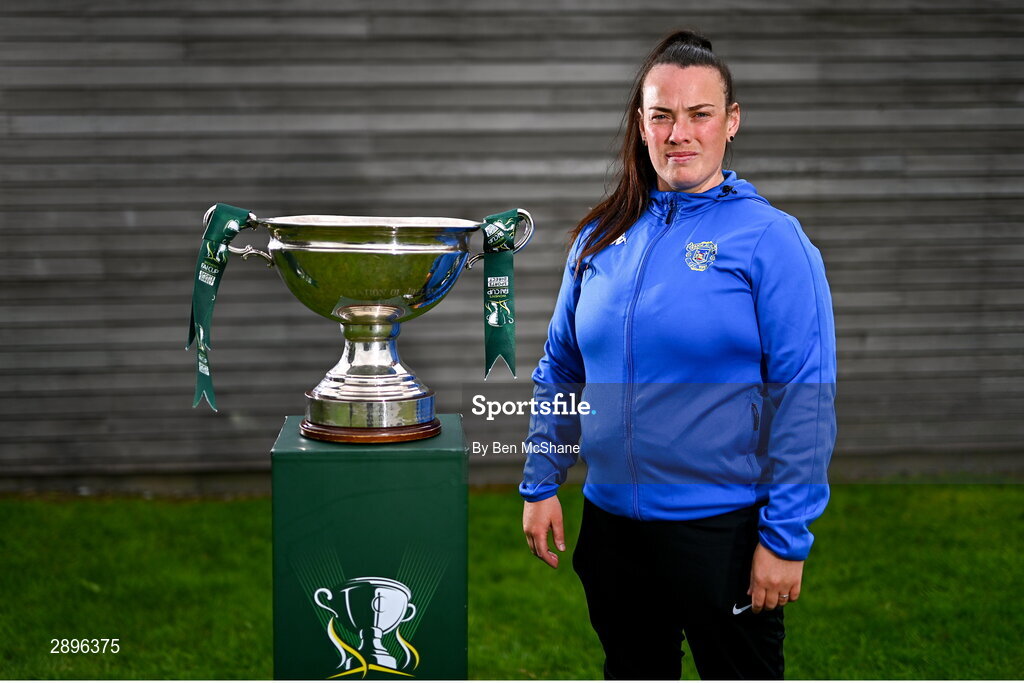 29 July 2024; Maggie Duncliffe of Douglas Hall poses for a portrait with the cup during a 2024 Sports Direct Women's FAI Cup First Round media day at FAI HQ in Dublin. Photo by Ben McShane/Sportsfile
