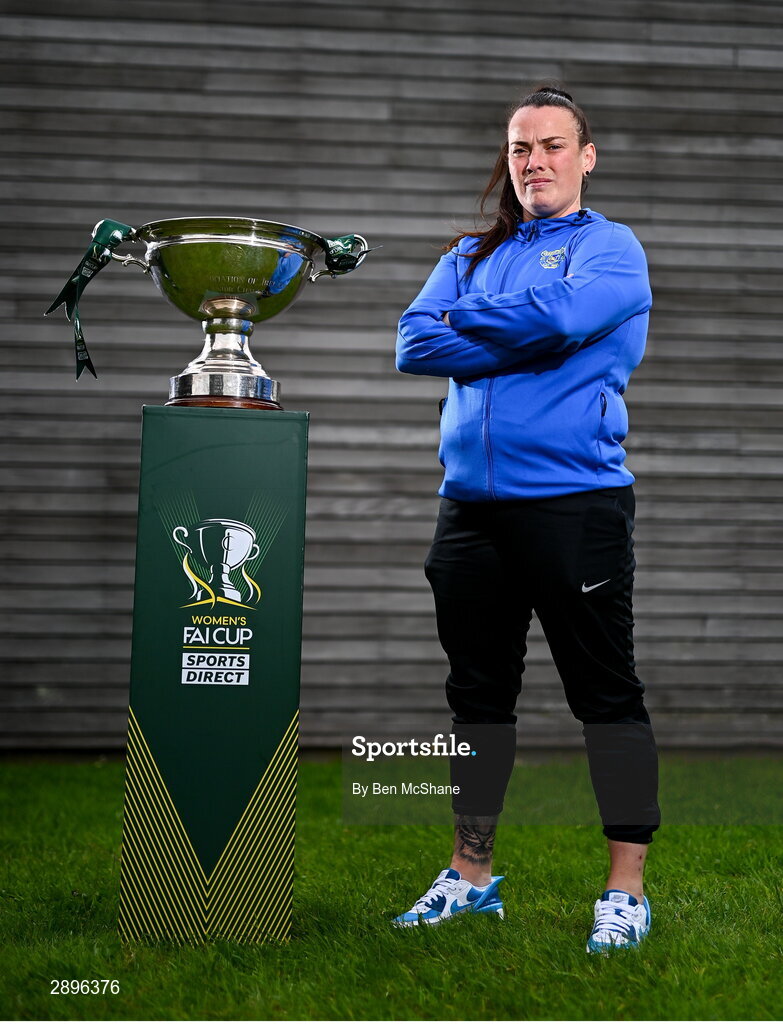 29 July 2024; Maggie Duncliffe of Douglas Hall poses for a portrait with the cup during a 2024 Sports Direct Women's FAI Cup First Round media day at FAI HQ in Dublin. Photo by Ben McShane/Sportsfile