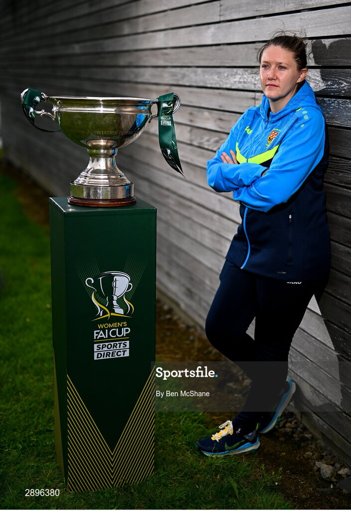 29 July 2024; Niamh Carroll of Ternure Rangers poses for a portrait with the cup during a 2024 Sports Direct Women's FAI Cup First Round media day at FAI HQ in Dublin. Photo by Ben McShane/Sportsfile