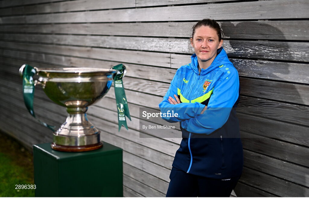 29 July 2024; Niamh Carroll of Ternure Rangers poses for a portrait with the cup during a 2024 Sports Direct Women's FAI Cup First Round media day at FAI HQ in Dublin. Photo by Ben McShane/Sportsfile