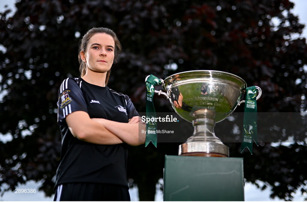 29 July 2024; Jane McKevitt of Whitehall Rangers pose for a portrait with the cup during a 2024 Sports Direct Women's FAI Cup First Round media day at FAI HQ in Dublin. Photo by Ben McShane/Sportsfile