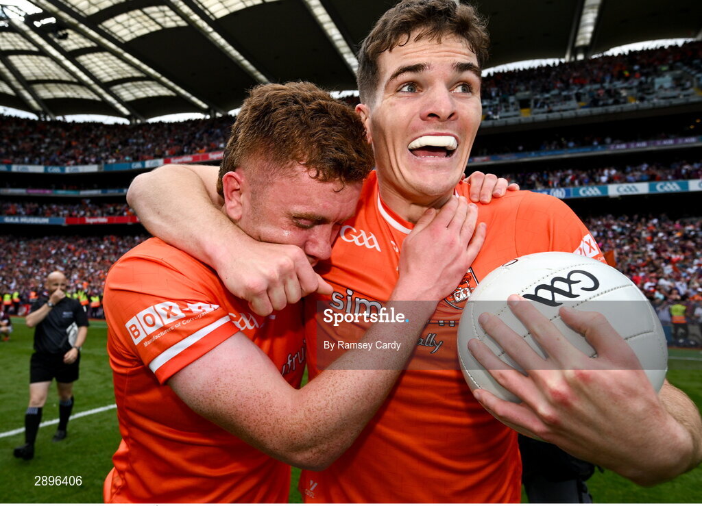 28 July 2024; Ross McQuillan, left, and Jarly Óg Burns of Armagh celebrate after the GAA Football All-Ireland Senior Championship Final match between Armagh and Galway at Croke Park in Dublin. Photo by Ramsey Cardy/Sportsfile