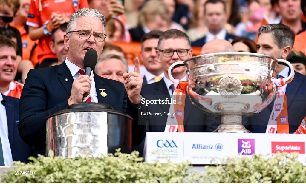 28 July 2024; Uachtarán Chumann Lúthchleas Gael Jarlath Burns after the GAA Football All-Ireland Senior Championship Final match between Armagh and Galway at Croke Park in Dublin. Photo by Ramsey Cardy/Sportsfile