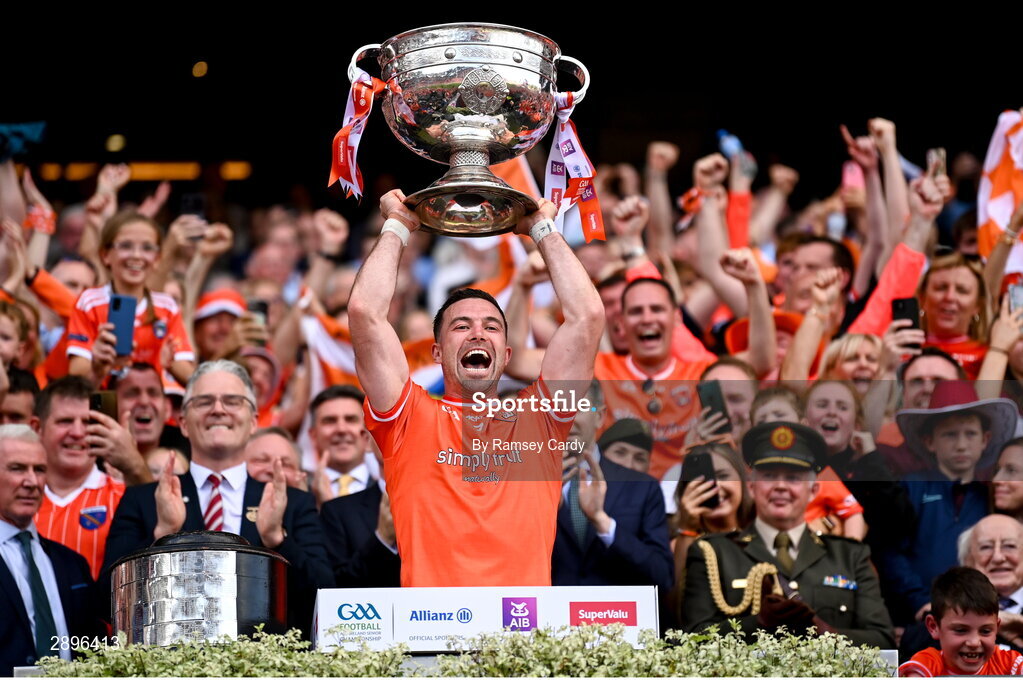 28 July 2024; Armagh captain Aidan Forker lifts the Sam Maguire Cup after winning the GAA Football All-Ireland Senior Championship Final match between Armagh and Galway at Croke Park in Dublin. Photo by Ramsey Cardy/Sportsfile
