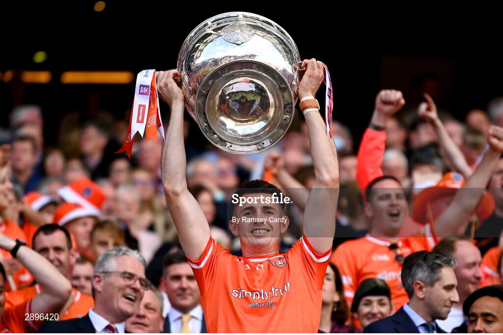 28 July 2024; Shane McPartlan of Armagh lifts the Sam Maguire Cup after the GAA Football All-Ireland Senior Championship Final match between Armagh and Galway at Croke Park in Dublin. Photo by Ramsey Cardy/Sportsfile