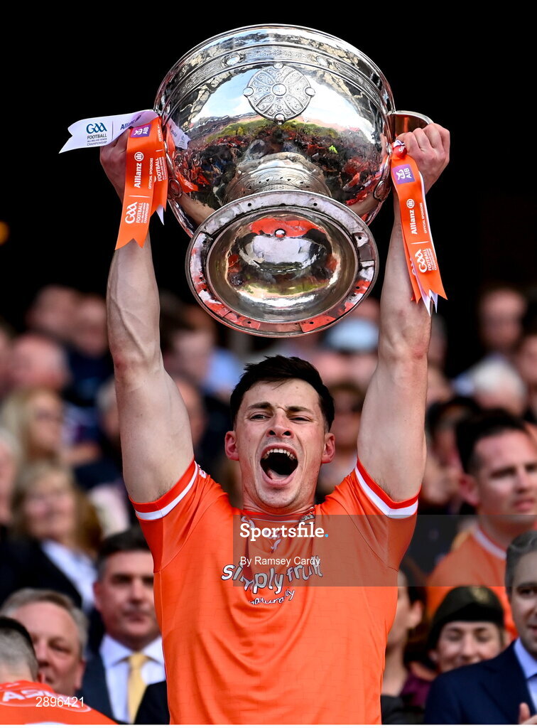 28 July 2024; Ciaran Higgins of Armagh lifts the Sam Maguire Cup after the GAA Football All-Ireland Senior Championship Final match between Armagh and Galway at Croke Park in Dublin. Photo by Ramsey Cardy/Sportsfile