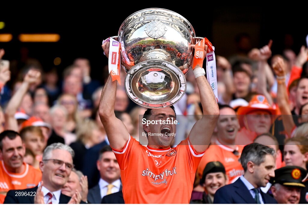 28 July 2024; Stefan Campbell of Armagh lifts the Sam Maguire cup after winning the GAA Football All-Ireland Senior Championship Final match between Armagh and Galway at Croke Park in Dublin. Photo by Ramsey Cardy/Sportsfile