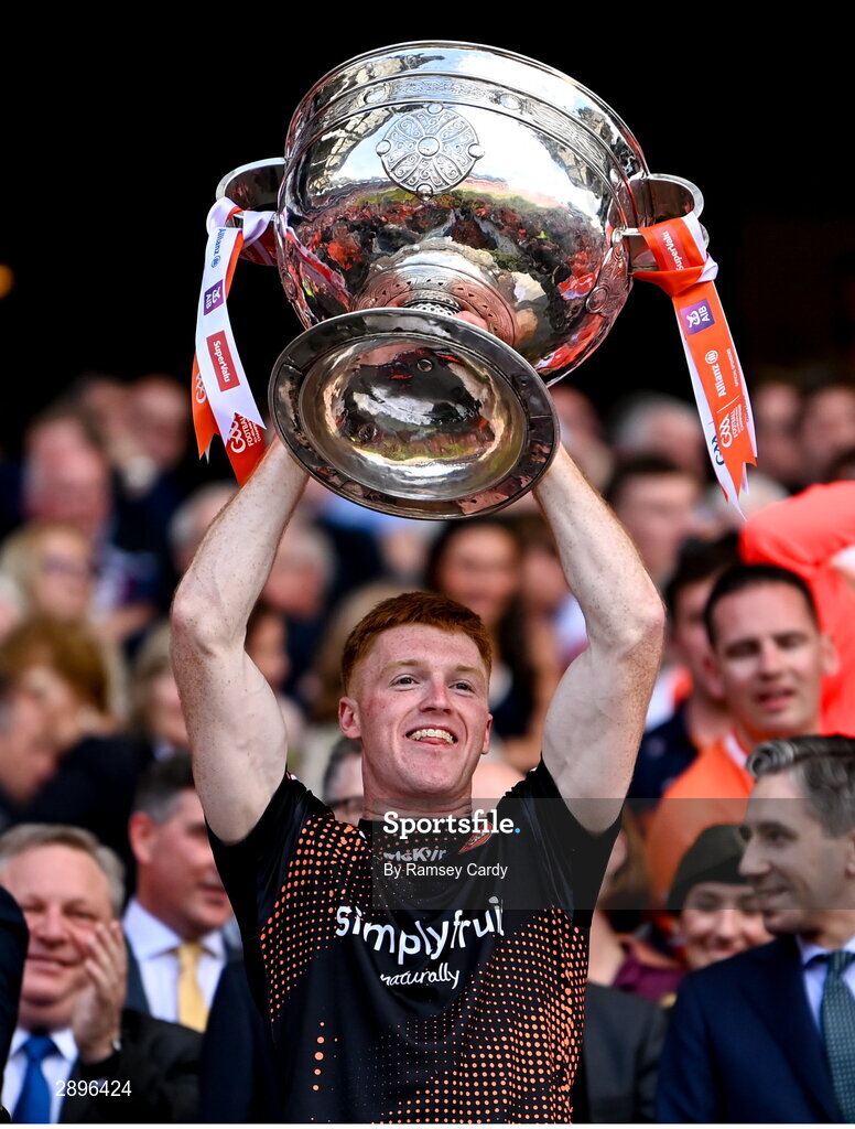 28 July 2024; Ciaran Mackin of Armagh lifts the Sam Maguire Cup after the GAA Football All-Ireland Senior Championship Final match between Armagh and Galway at Croke Park in Dublin. Photo by Ramsey Cardy/Sportsfile