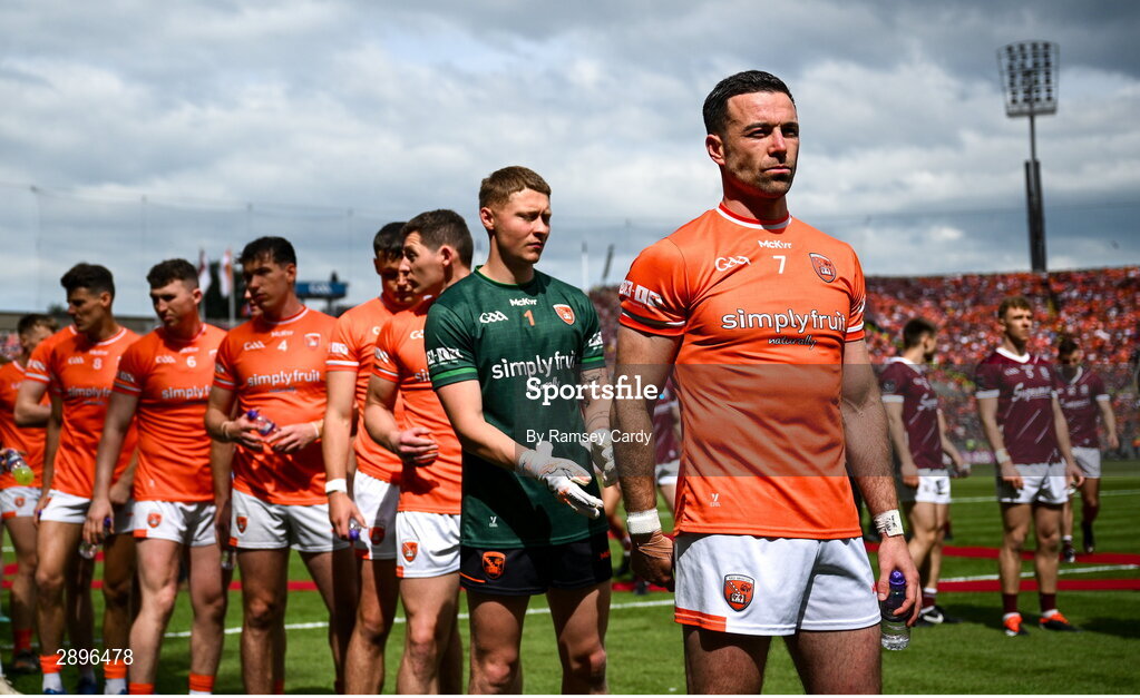 28 July 2024; Armagh captain Aidan Forker leads his side through the parade before the GAA Football All-Ireland Senior Championship Final match between Armagh and Galway at Croke Park in Dublin. Photo by Ramsey Cardy/Sportsfile