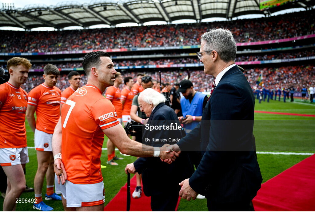 28 July 2024; Uachtarán Chumann Lúthchleas Gael Jarlath Burns greets Armagh captain Aidan Forker before the GAA Football All-Ireland Senior Championship Final match between Armagh and Galway at Croke Park in Dublin. Photo by Ramsey Cardy/Sportsfile