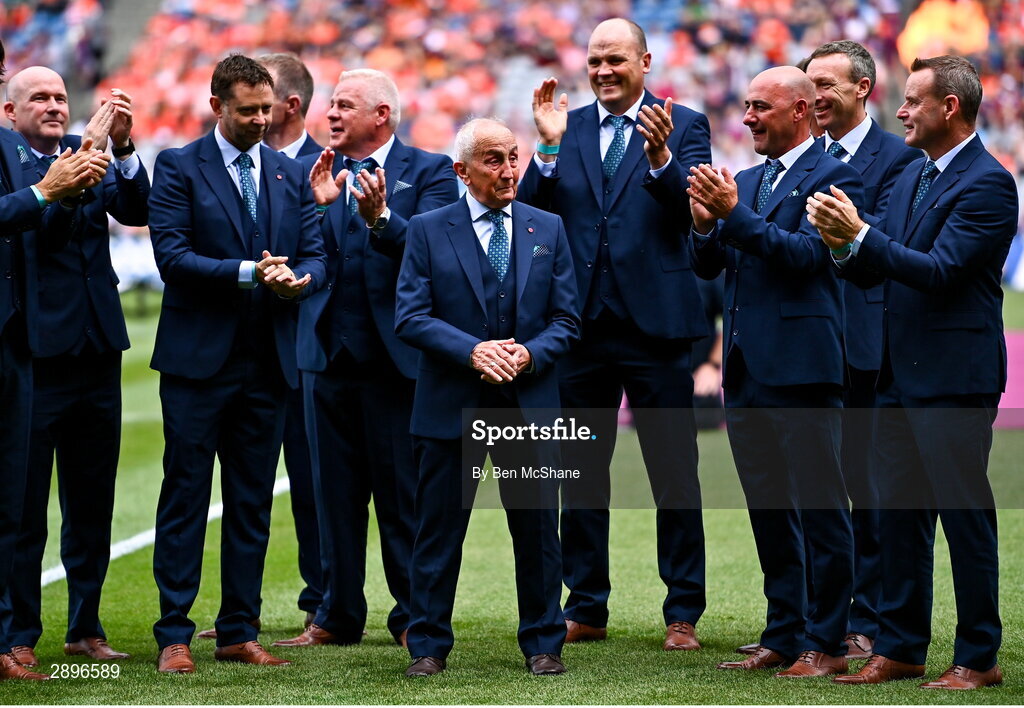 28 July 2024; 1999 All-Ireland winning Meath players perform a guard of honour around manager Sean Boylan of the 1999 All-Ireland winning Meath football jubilee team who were honoured before the GAA Football All-Ireland Senior Championship Final match between Armagh and Galway at Croke Park in Dublin. Photo by Ben McShane/Sportsfile