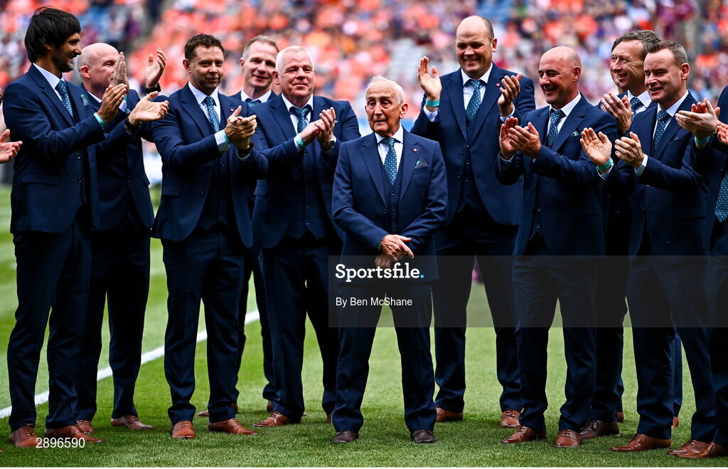 28 July 2024; 1999 All-Ireland winning Meath players perform a guard of honour around manager Sean Boylan of the 1999 All-Ireland winning Meath football jubilee team who were honoured before the GAA Football All-Ireland Senior Championship Final match between Armagh and Galway at Croke Park in Dublin. Photo by Ben McShane/Sportsfile
