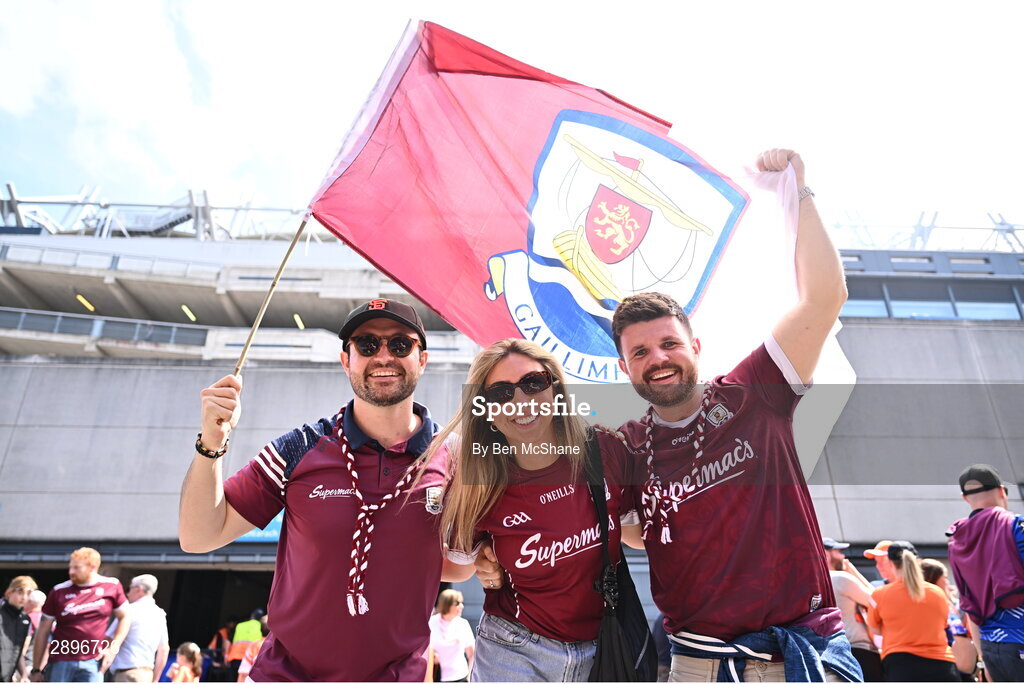 28 July 2024; Galway supporters Robert Leahy, Eimear Neilan, Chris Dunne during the GAA Football All-Ireland Senior Championship Final match between Armagh and Galway at Croke Park in Dublin. Photo by Ben McShane/Sportsfile