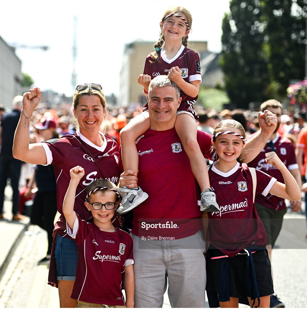 28 July 2024; Galway supporters, left to right, Aisling Hamilton, Gavin Leonard, aged 6, Greg Leonard, Sarah Leonard, aged 6, and Alison Leonard, aged 11, from Furbo, Co Galway, ahead of the GAA Football All-Ireland Senior Championship Final match between Armagh and Galway at Croke Park in Dublin. Photo by Daire Brennan/Sportsfile