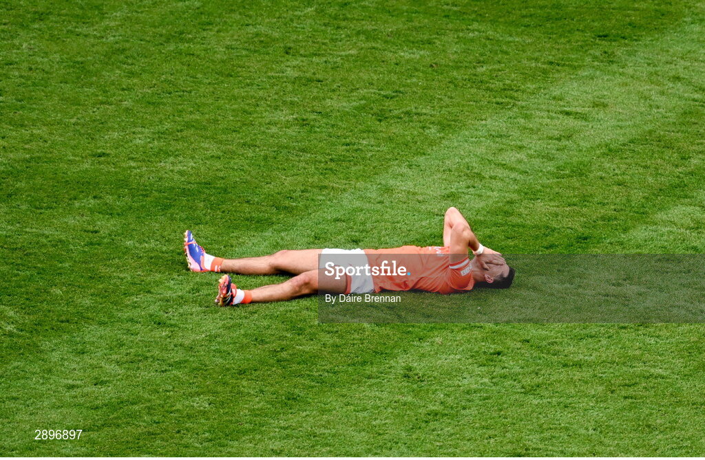 28 July 2024; Stefan Campbell of Armagh reacts at the final whistle of the GAA Football All-Ireland Senior Championship Final match between Armagh and Galway at Croke Park in Dublin. Photo by Daire Brennan/Sportsfile