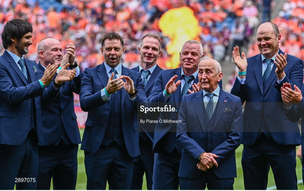28 July 2024; Seán Boylan, front, manager of the 1999 All-Ireland winning Meath football football jubilee team who were honoured, before the GAA Football All-Ireland Senior Championship Final match between Armagh and Galway at Croke Park in Dublin. Photo by Piaras Ó Mídheach/Sportsfile