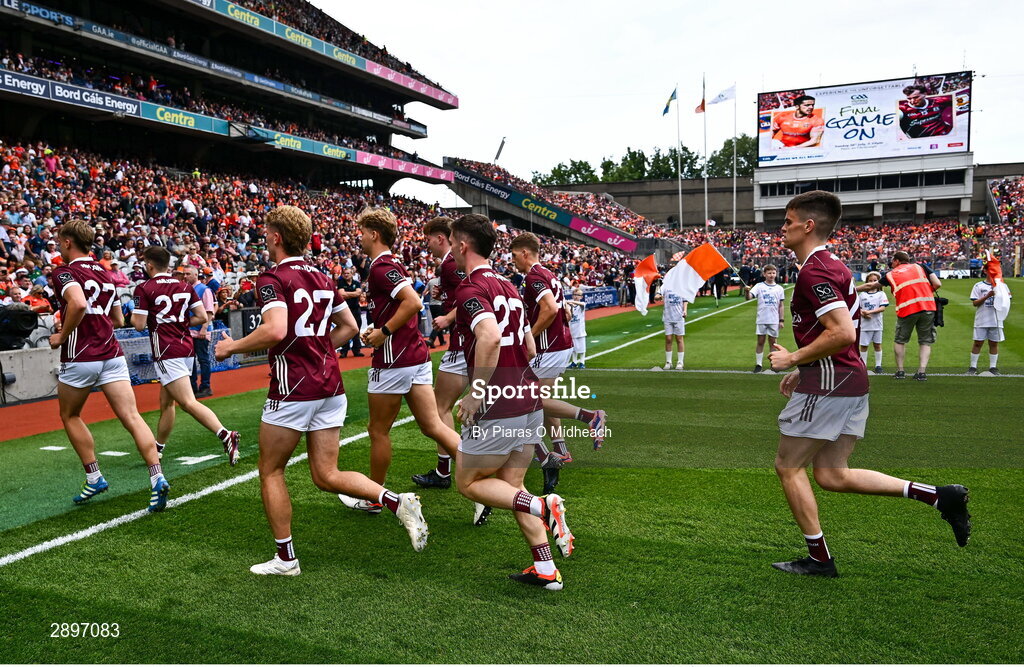 28 July 2024; Galway extended panel members, all wearing 27, make their way off the pitch after the squad photo before the GAA Football All-Ireland Senior Championship Final match between Armagh and Galway at Croke Park in Dublin. Photo by Piaras Ó Mídheach/Sportsfile