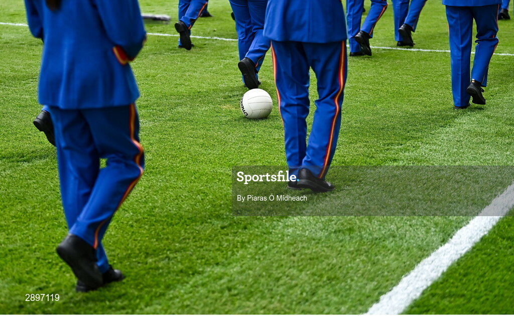 28 July 2024; Members of The Artane Band march past a stray football from the Galway warm-up before the GAA Football All-Ireland Senior Championship Final match between Armagh and Galway at Croke Park in Dublin.The Artane Band Photo by Piaras Ó Mídheach/Sportsfile