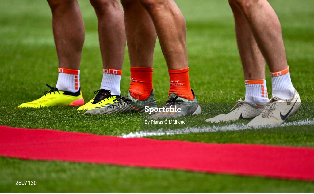 28 July 2024; The socks and boots of Armagh players at the red carpet to meet President of Ireland Michael D Higgins before the GAA Football All-Ireland Senior Championship Final match between Armagh and Galway at Croke Park in Dublin. Photo by Piaras Ó Mídheach/Sportsfile