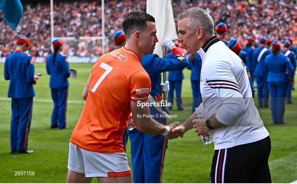 28 July 2024; Armagh captain Aidan Forker shakes hands with Galway manager Pádraic Joyce before the GAA Football All-Ireland Senior Championship Final match between Armagh and Galway at Croke Park in Dublin. Photo by Piaras Ó Mídheach/Sportsfile