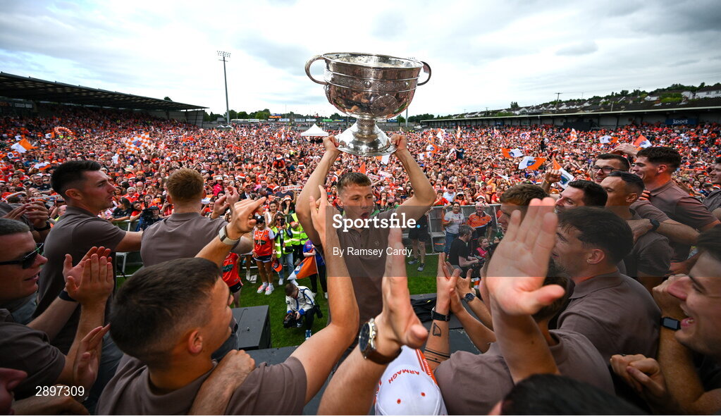 29 July 2024; Rian O'Neill holds the Sam Maguire Cup aloft at the homecoming celebrations of the All-Ireland Senior Football Champions at BOX-IT Athletic Grounds in Armagh. Photo by Ramsey Cardy/Sportsfile