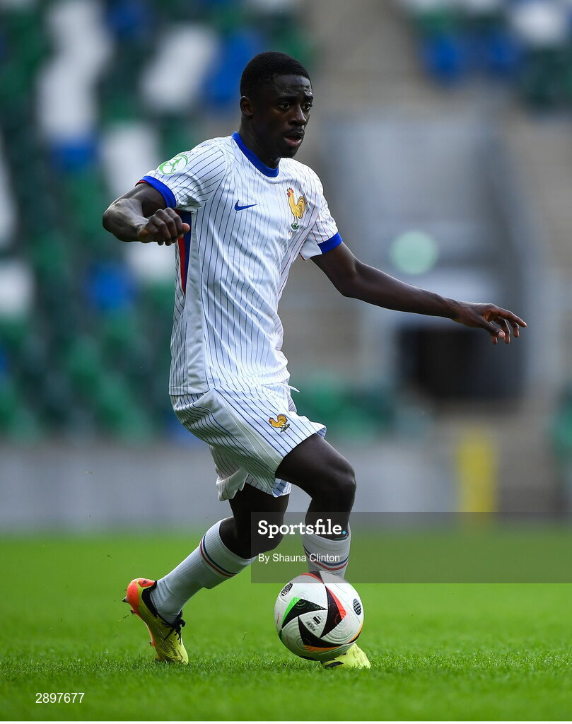 28 July 2024; Sael Kumbedi of France during the UEFA European U19 Championship finals match between Spain and France at the National Football Stadium at Windsor Park, Belfast. Photo by Shauna Clinton/Sportsfile