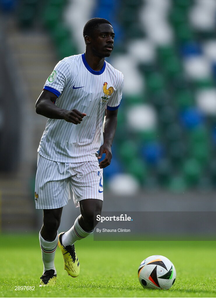28 July 2024; Sael Kumbedi of France during the UEFA European U19 Championship finals match between Spain and France at the National Football Stadium at Windsor Park, Belfast. Photo by Shauna Clinton/Sportsfile