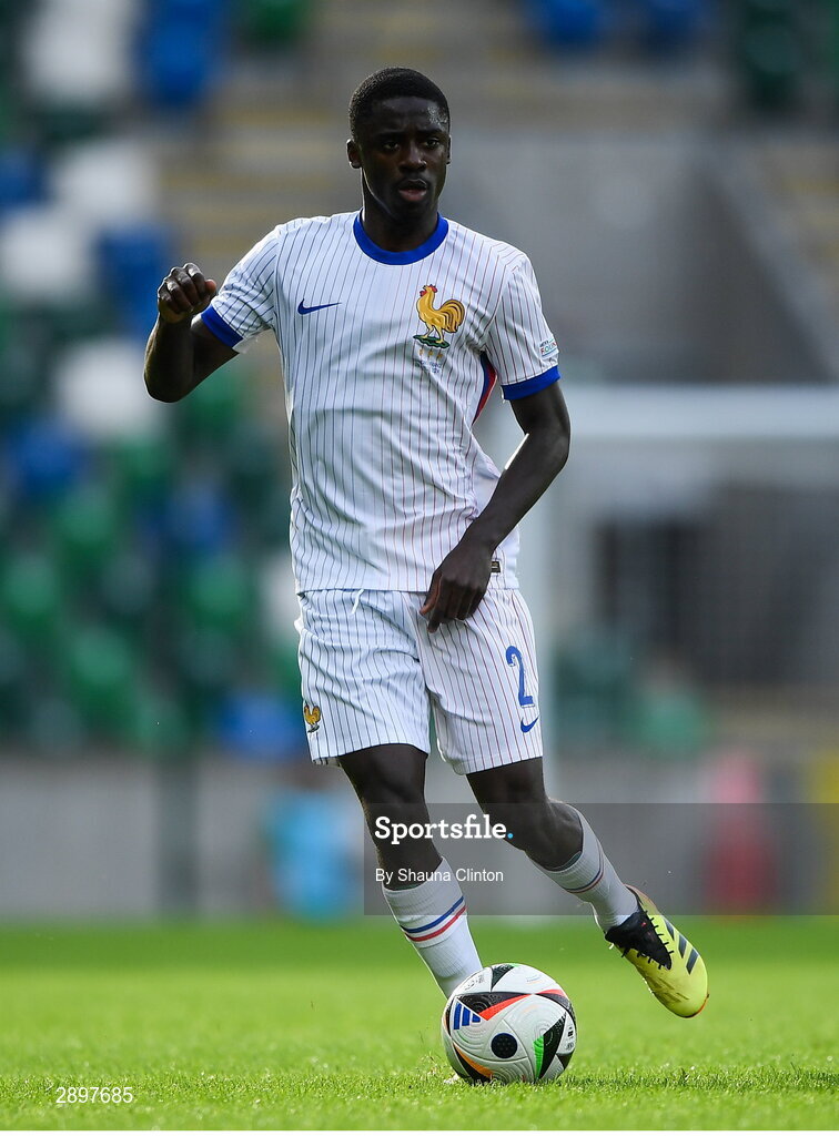28 July 2024; Sael Kumbedi of France during the UEFA European U19 Championship finals match between Spain and France at the National Football Stadium at Windsor Park, Belfast. Photo by Shauna Clinton/Sportsfile