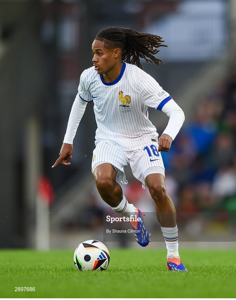 28 July 2024; Mathis Amougou of France during the UEFA European U19 Championship finals match between Spain and France at the National Football Stadium at Windsor Park, Belfast. Photo by Shauna Clinton/Sportsfile