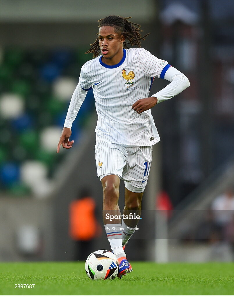 28 July 2024; Mathis Amougou of France during the UEFA European U19 Championship finals match between Spain and France at the National Football Stadium at Windsor Park, Belfast. Photo by Shauna Clinton/Sportsfile