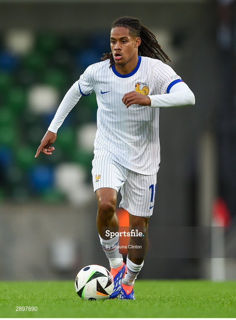 28 July 2024; Mathis Amougou of France during the UEFA European U19 Championship finals match between Spain and France at the National Football Stadium at Windsor Park, Belfast. Photo by Shauna Clinton/Sportsfile