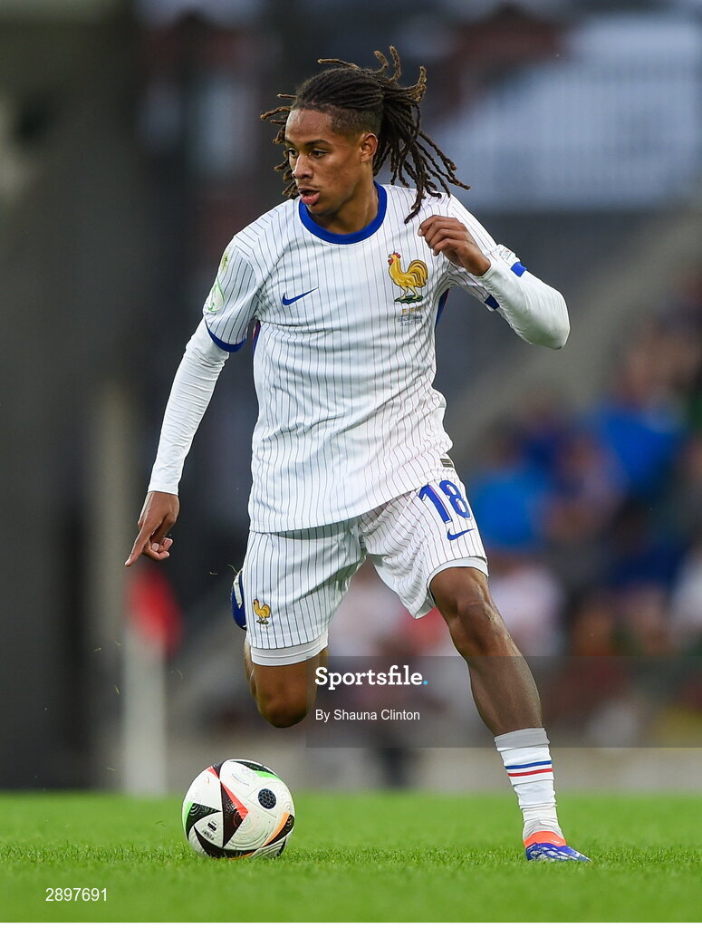 28 July 2024; Mathis Amougou of France during the UEFA European U19 Championship finals match between Spain and France at the National Football Stadium at Windsor Park, Belfast. Photo by Shauna Clinton/Sportsfile