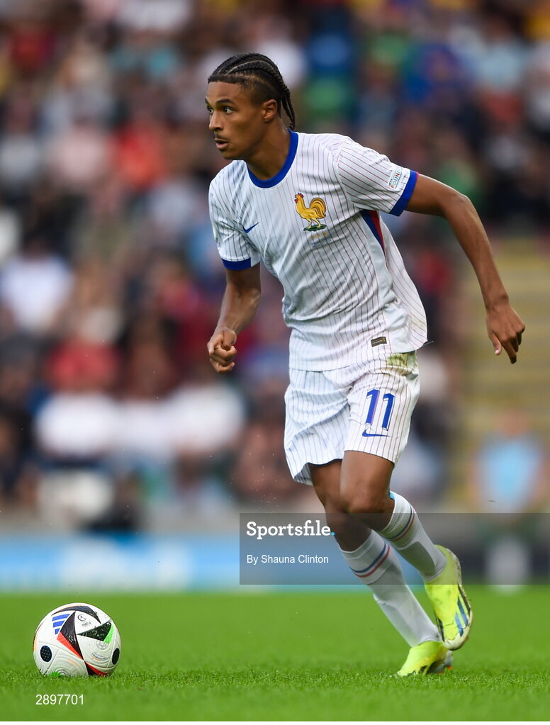 28 July 2024; Jean-Mattéo Bahoya of France during the UEFA European U19 Championship finals match between Spain and France at the National Football Stadium at Windsor Park, Belfast. Photo by Shauna Clinton/Sportsfile