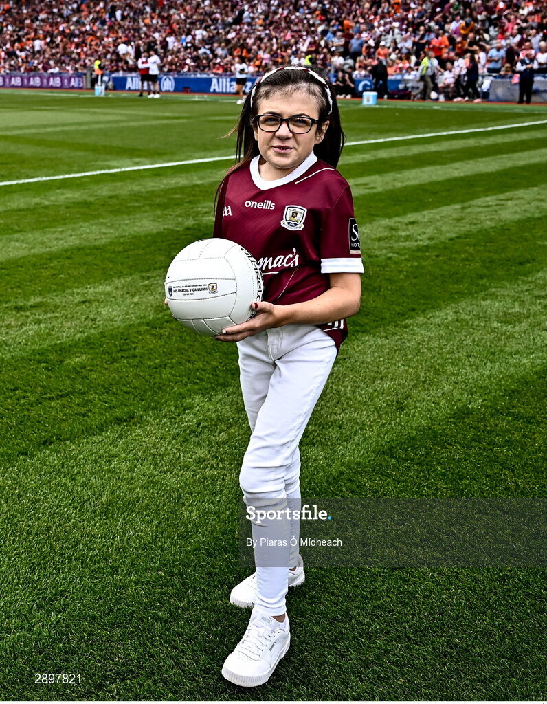 28 July 2024; Caitríona Ní Shé with the match ball before the GAA Football All-Ireland Senior Championship Final match between Armagh and Galway at Croke Park in Dublin. Photo by Piaras Ó Mídheach/Sportsfile
