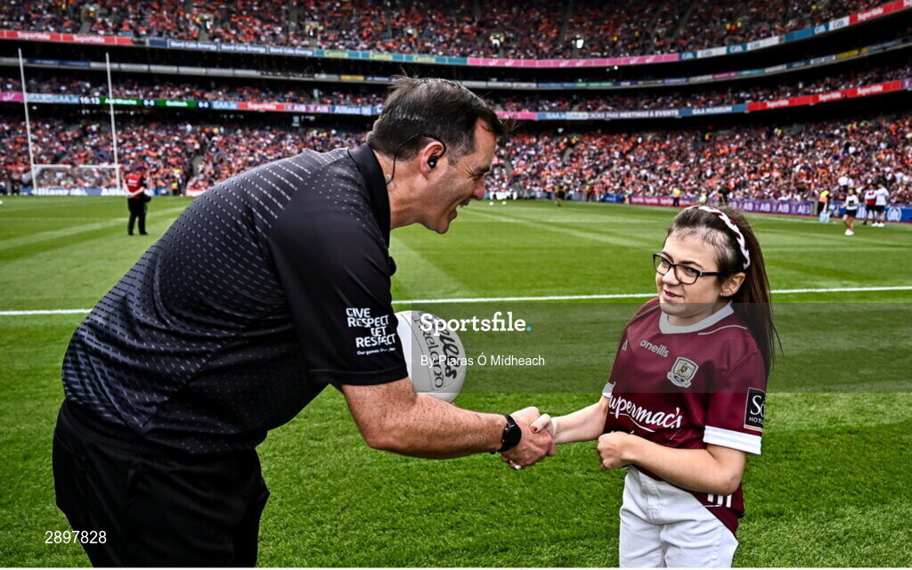 28 July 2024; Caitríona Ní Shé presents the match ball to referee Seán Hurson before the GAA Football All-Ireland Senior Championship Final match between Armagh and Galway at Croke Park in Dublin. Photo by Piaras Ó Mídheach/Sportsfile